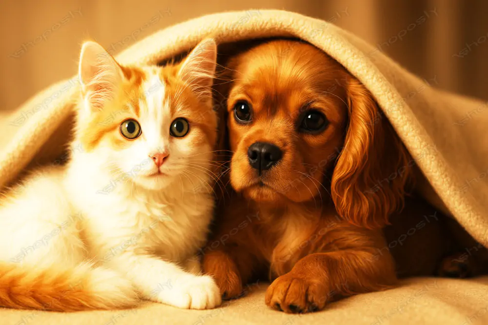 This ultra-high-resolution (4500 x 3000 px) AI-generated portrait captures a deeply heartwarming and tender moment between two of the most beloved companion animals—a fluffy white-and-orange kitten and an adorable golden-brown puppy—nestled closely together under the soft shelter of a beige fleece blanket. The image radiates comfort, companionship, and innocence, making it an irresistible visual for pet lovers, animal-themed campaigns, and warm, family-oriented designs.