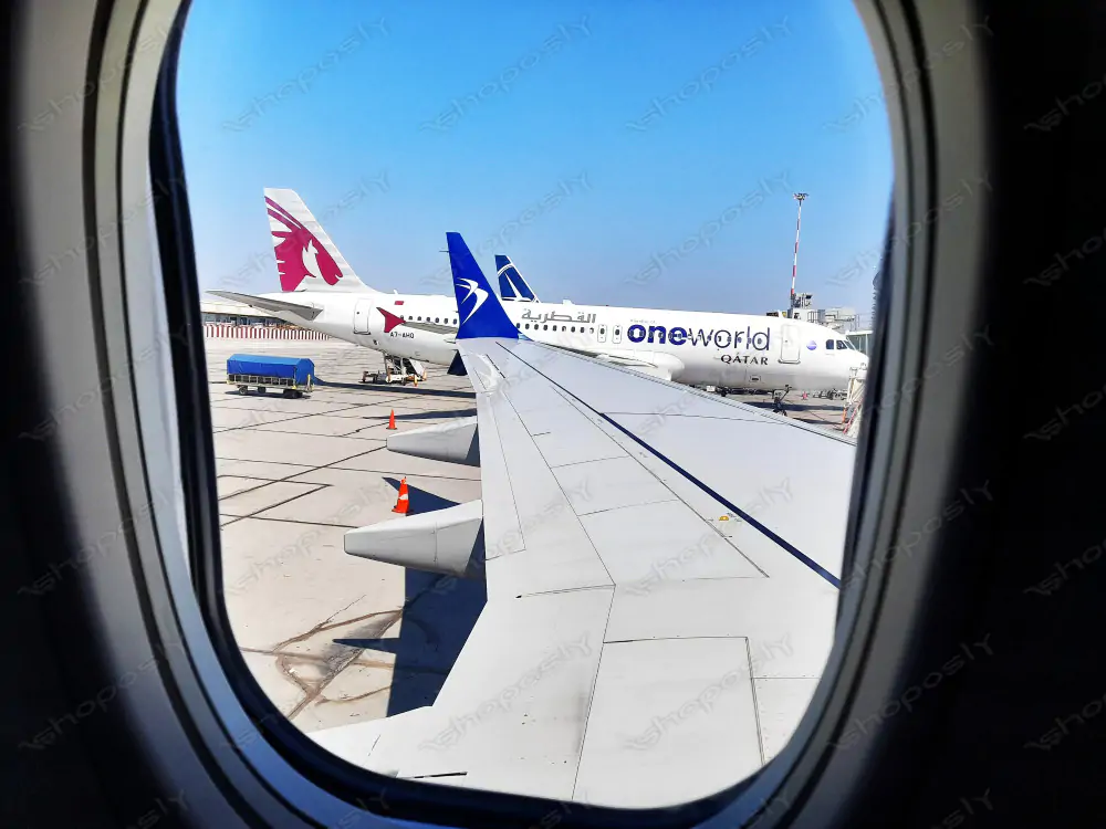 The first image grounds the viewer firmly on the tarmac. Through the curved frame of an airplane window, a sleek wing extends outward under a flawless blue sky. Beyond, two aircraft from Qatar Airways, including one in a distinctive oneworld alliance livery, rest in their gates. The precision of the scene—the painted lines, safety cones, ground service equipment—contrasts with the anticipation of imminent takeoff. The sharpness of the image reveals every detail: the metallic gleam of the wing, the airline branding, and the subtle gradients in the morning sky. This photograph captures the calm before motion, a moment where the journey is just about to begin.