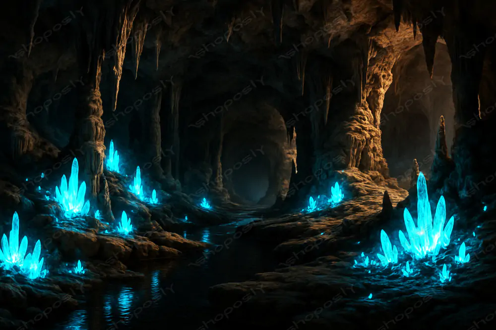 While glowing blue crystals of this intensity are rarely found in nature, the scene draws on real-world phenomena like fluorescent minerals and bioluminescent organisms. By blending authentic geological formations with an exaggerated luminous effect, the artwork feels believable while still retaining its fantasy allure. The underground river and its mirrored glow provide a natural realism that grounds the composition in plausible environmental design.
