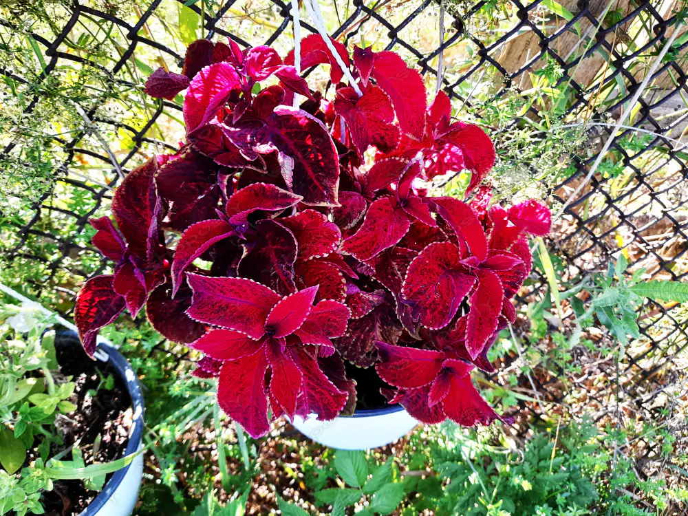 The Coleus is positioned against a backdrop of a wire fence interwoven with strands of wild greenery. The neutral, somewhat rustic background provides contrast without distracting from the main subject, making the plant’s vivid magenta tones stand out even more. A nearby potted plant in the corner of the composition introduces an additional note of natural life, but the focus remains firmly on the Coleus and its dramatic foliage.