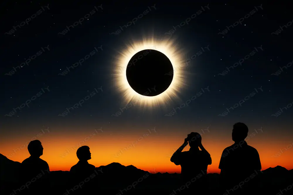 Just below the cosmic event, we see four silhouetted human figures, each looking upward in awe. Their presence offers a sense of grounding — a connection between this vast cosmic occurrence and our earthly existence. One figure holds binoculars to their face, possibly an amateur astronomer or an eager enthusiast unable to resist the urge to capture every detail. The remaining three stand still, embodying the universal reaction of humans encountering the sublime — quiet reverence, curiosity, and reflection.