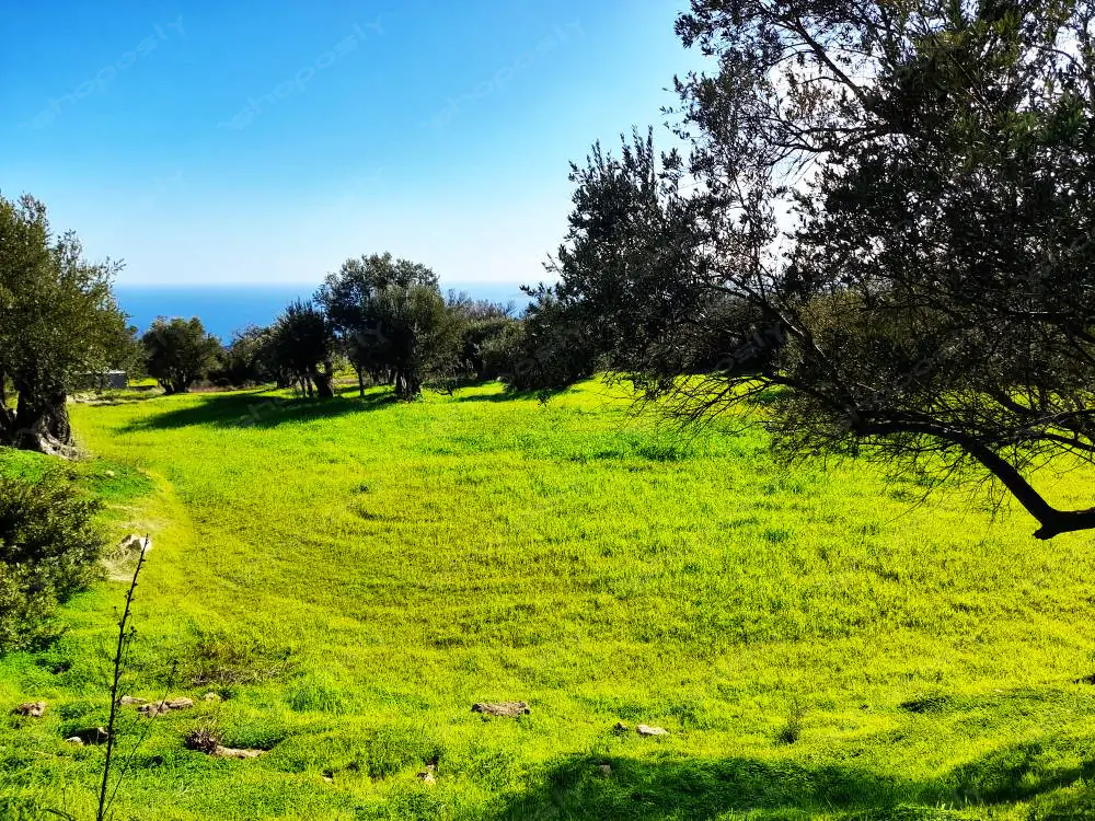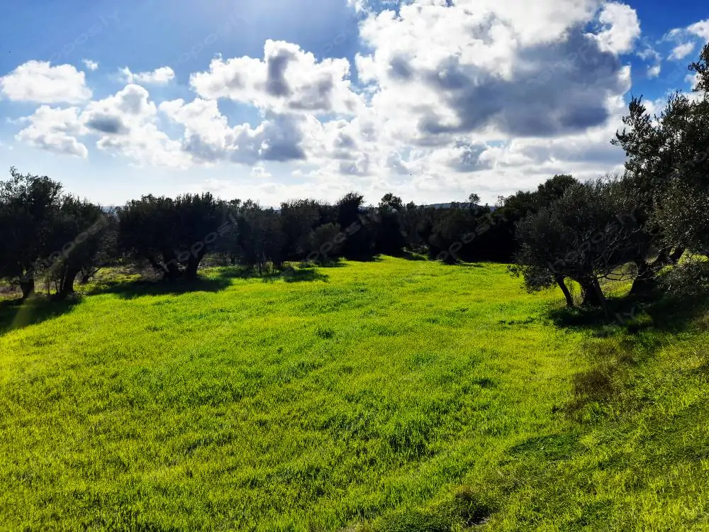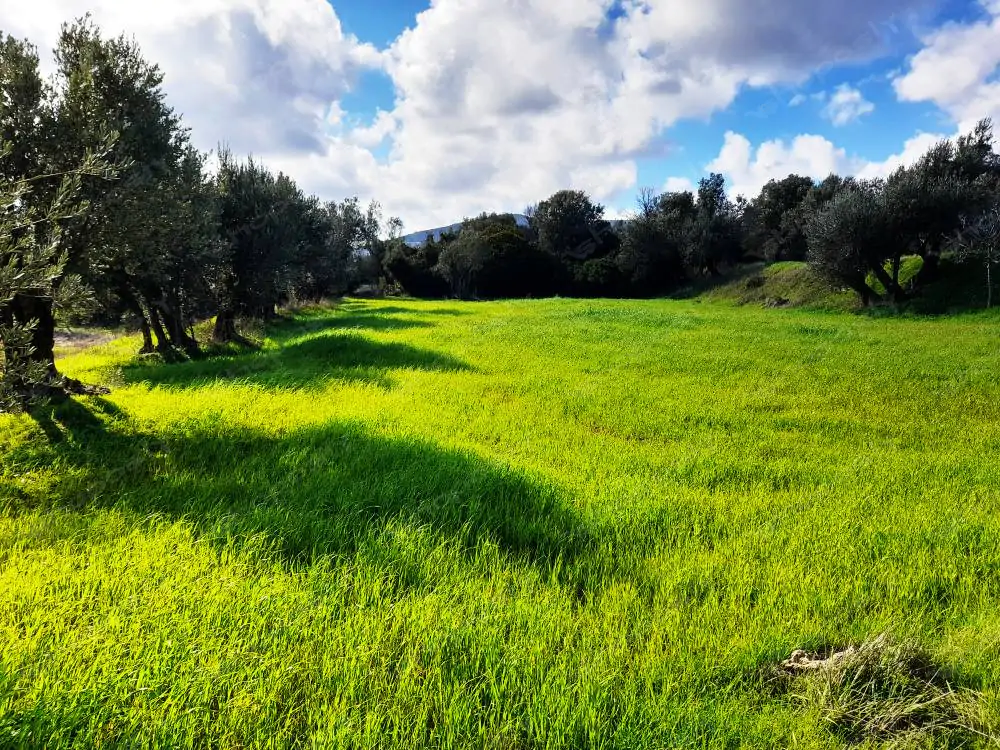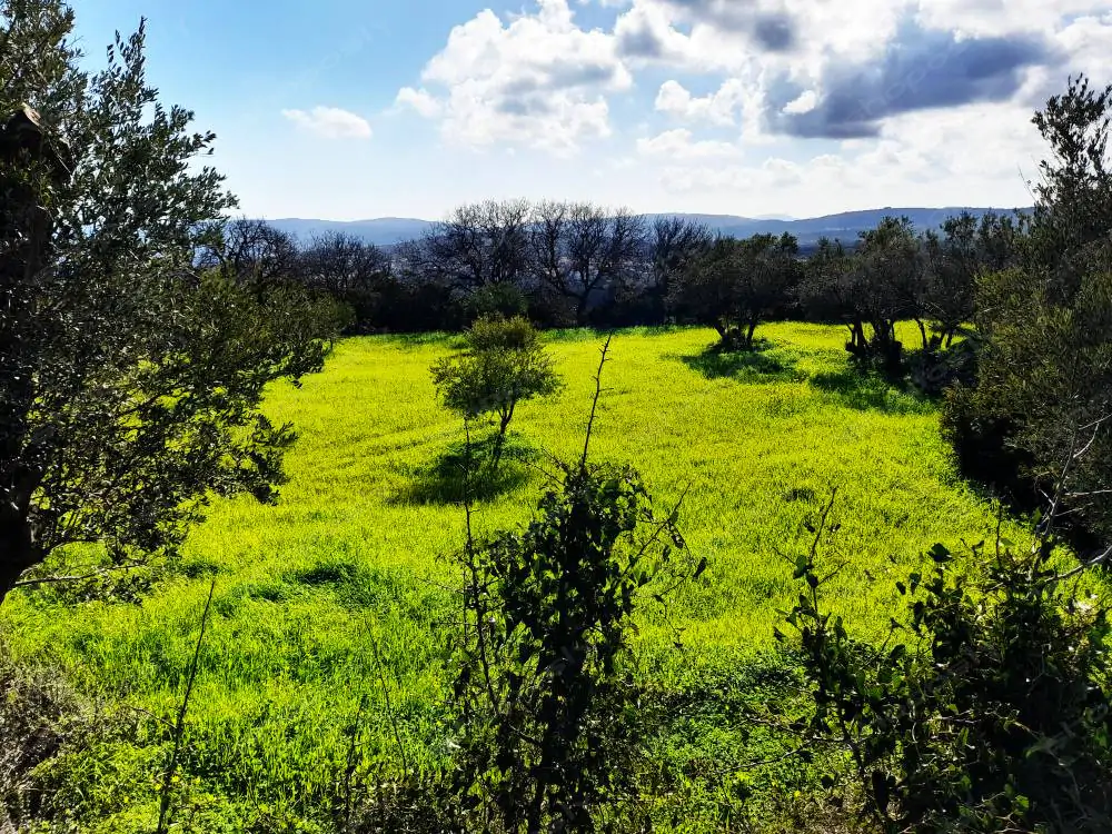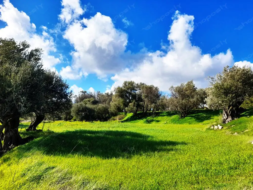 In this opening shot, the field is framed between olive branches, but the grass steals the show. Thick, dense, and luminescent, the grass appears like a green fire burning quietly across the land. Long shadows from nearby trees stretch diagonally, adding dimensional texture to the carpet of life. The sun illuminates it from the side, giving it both highlights and depth. Far-off hills and bare-branched trees signal the end of winter, yet the dominant field below is already in full rebirth.