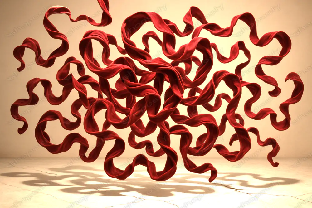 “Floating Velvet Ribbons” is a hyper-realistic abstract composition featuring dozens of deep red velvet strands suspended in mid-air against a neutral cream backdrop. Each ribbon twists, folds, and weaves through invisible space, casting soft shadows on the cracked floor beneath. The lighting evokes the precision of a gallery spotlight — highlighting rich textures and subtle gradient tones.