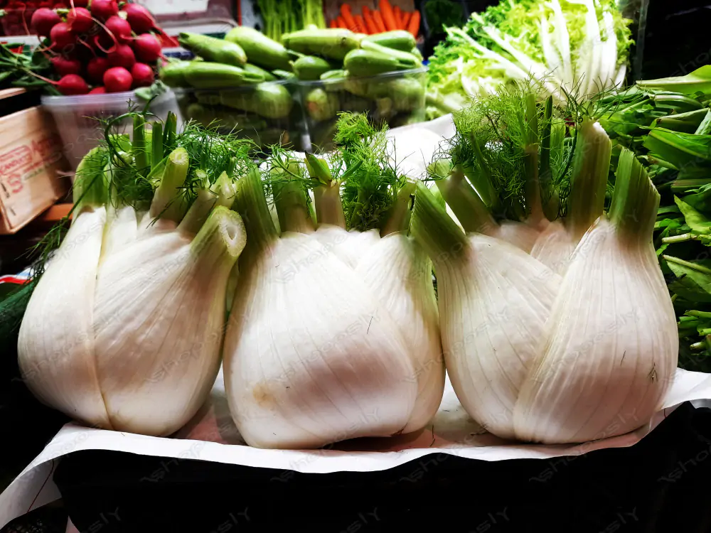 Step into the vibrant atmosphere of a bustling produce market with this ultra-high-resolution (4000 x 3000 px) photograph of fresh fennel bulbs, captured in pristine detail and natural lighting. The image offers a close-up view of a neatly arranged display of plump, ivory-white fennel bulbs, their smooth, layered flesh crowned with delicate green fronds that hint at their aromatic, slightly sweet, and anise-like flavor.