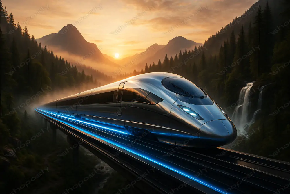 The image presents a perfectly composed visual story: one of motion, innovation, and balance. It invites the viewer to imagine a world where ultra-modern transit systems coexist peacefully with pristine ecosystems — a blueprint for the sustainable future.