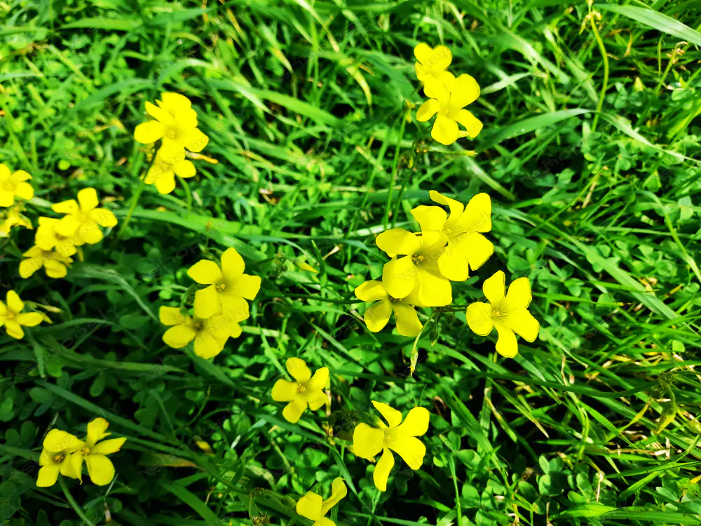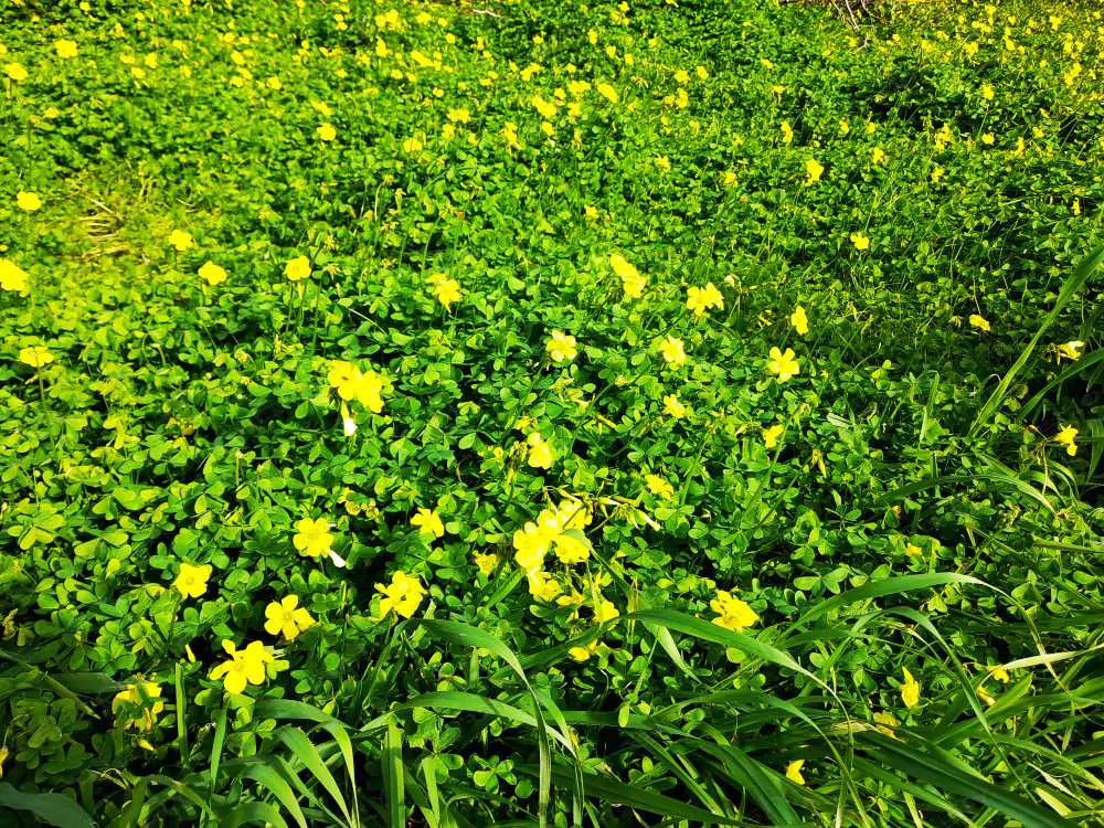 The star of the series is the small yellow flower — likely Oxalis pes-caprae (commonly known as Bermuda buttercup or sourgrass) — blooming freely among vibrant greenery. Its simple five-petal form glows in the sunlight like scattered gold coins on a sea of green. These blossoms are native to the Mediterranean and flourish during the cooler months, adding brightness and vibrancy to otherwise quiet fields.