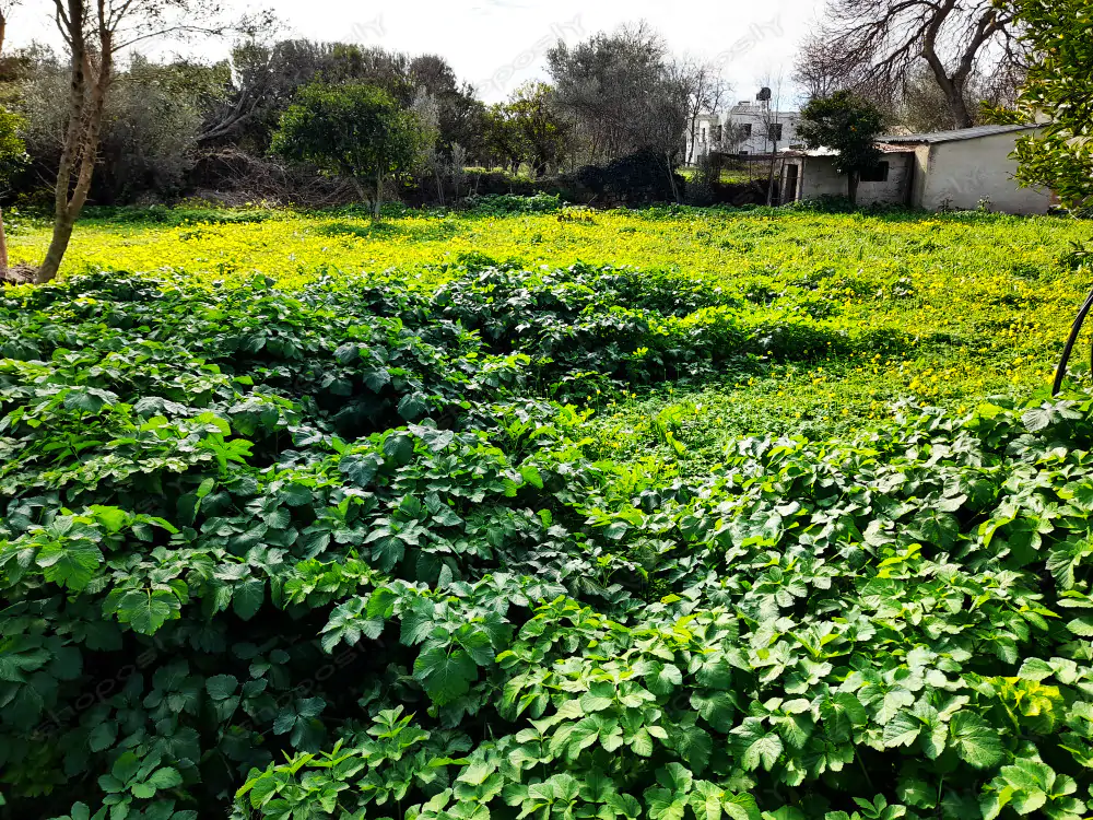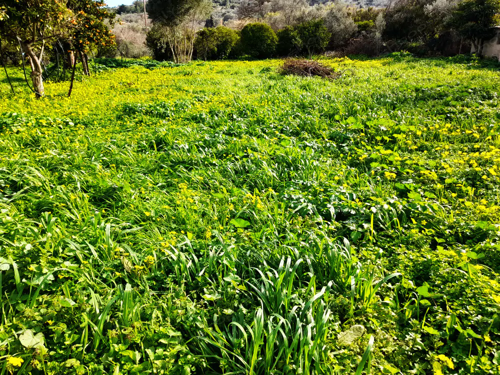 Olive trees, citrus trees with visible orange fruits, and other Mediterranean flora define the outer boundaries of the field, providing height, shadow, and a sense of location.