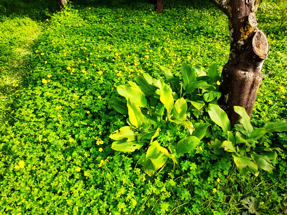 The presence of Oxalis, cool-hued foliage, and rich green grass suggests late winter or early spring — a time when the land renews itself with vigor.
