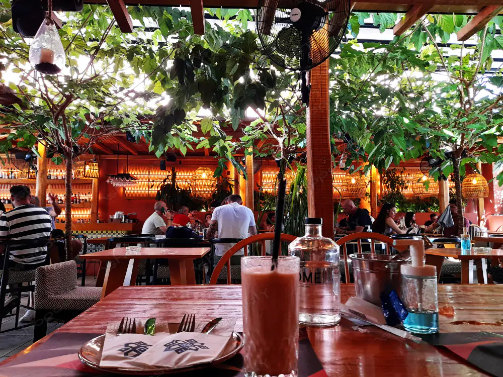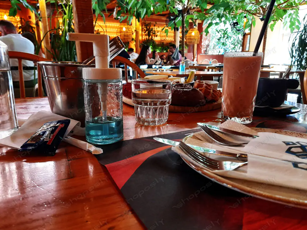 The café setting itself adds to the charm of this breakfast experience. Tall green plants and leafy indoor trees create a refreshing, garden-like atmosphere, while warm wooden beams and soft lighting evoke a feeling of comfort and relaxation. The soft background buzz of customers, seen chatting and enjoying their own meals, creates a lively yet intimate environment. The tables are set with rustic ceramic plates, neatly folded napkins with polished silverware, and glasses of freshly blended smoothies in soft peach-pink tones, hinting at tropical fruit combinations.