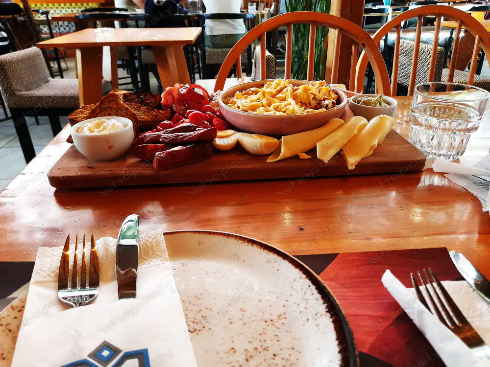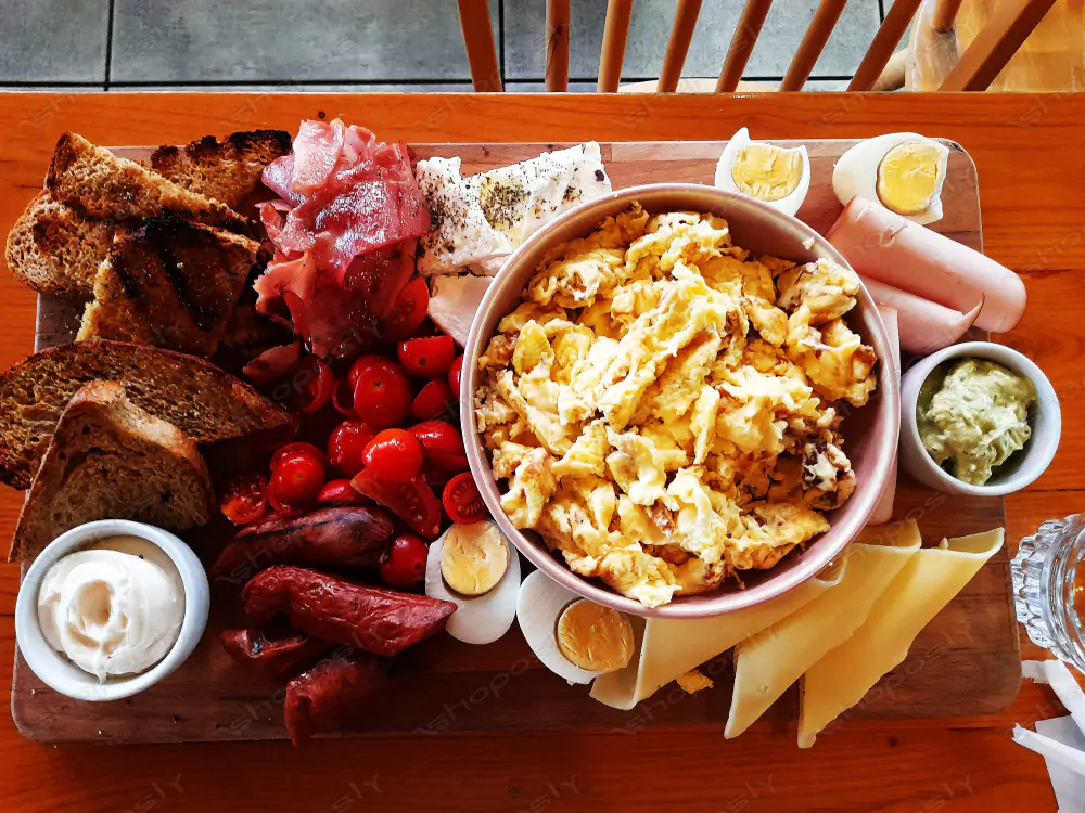 The centerpiece of this breakfast experience is a generously arranged wooden serving board brimming with an assortment of savory and sweet delights. At the heart lies a heaping bowl of creamy scrambled eggs, their golden-yellow color hinting at perfect cooking and rich flavor. Around the eggs, a carefully curated selection of accompaniments offers an ideal balance of taste and texture: smoky grilled sausages sliced for easy serving, thinly shaved ham and turkey, tangy feta cheese sprinkled with herbs, wedges of hard-boiled eggs, and slices of semi-hard cheese elegantly folded for presentation.