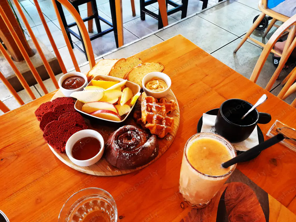 In the sweet selection, a second serving board features a tempting mix of pastries and fresh fruits. Thick slices of moist red velvet cake, a perfectly swirled cinnamon roll dusted with powdered sugar, and a golden waffle piece invite diners to enjoy a dessert-style morning. Fresh apple slices, both red and green, offer a refreshing, crisp contrast, while small bowls of golden honey, caramel sauce, and nut butter stand ready for drizzling and spreading. This thoughtful combination of flavors ensures that every palate is catered to, from those who prefer savory satisfaction to those who start the day with sweetness.
