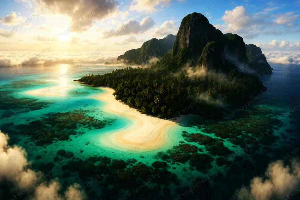 This awe-inspiring AI-generated masterpiece captures the essence of paradise — an untouched tropical island bathed in golden morning light, surrounded by vibrant coral reefs, turquoise waters, and towering jungle-clad cliffs. Every pixel of this panoramic view overflows with serenity, majesty, and realism, making this image an ideal choice for fine wall art, travel branding, or any visual storytelling centered on the concept of a utopian escape.
