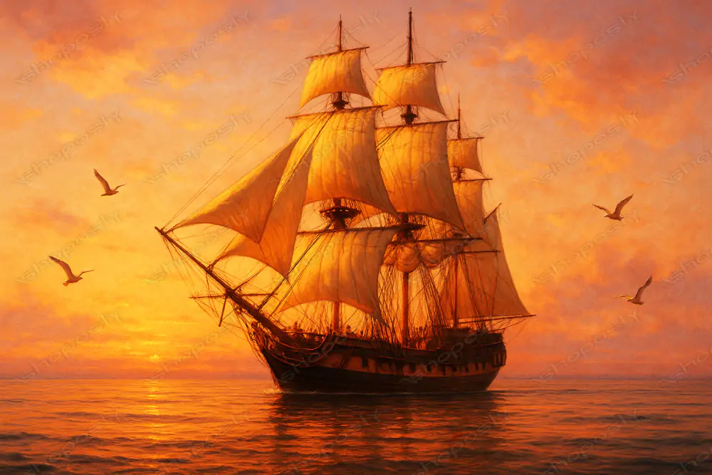 The tall ship represents more than just a vessel — it is a metaphor for human spirit, resilience, and curiosity. Its journey through calm waters under a setting sun symbolizes safe passage, the beauty of patience, and the poetic nature of transition — from day to night, from old to new.