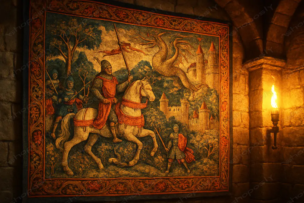 Medieval tapestries were far more than decoration—they were records of lineage, battles, and cultural values. They adorned castle walls, insulating stone halls and proclaiming the glory of rulers and warriors. This scene, with its knight confronting a dragon, draws upon the enduring Saint George and the Dragon motif while leaving room for imaginative reinterpretation.