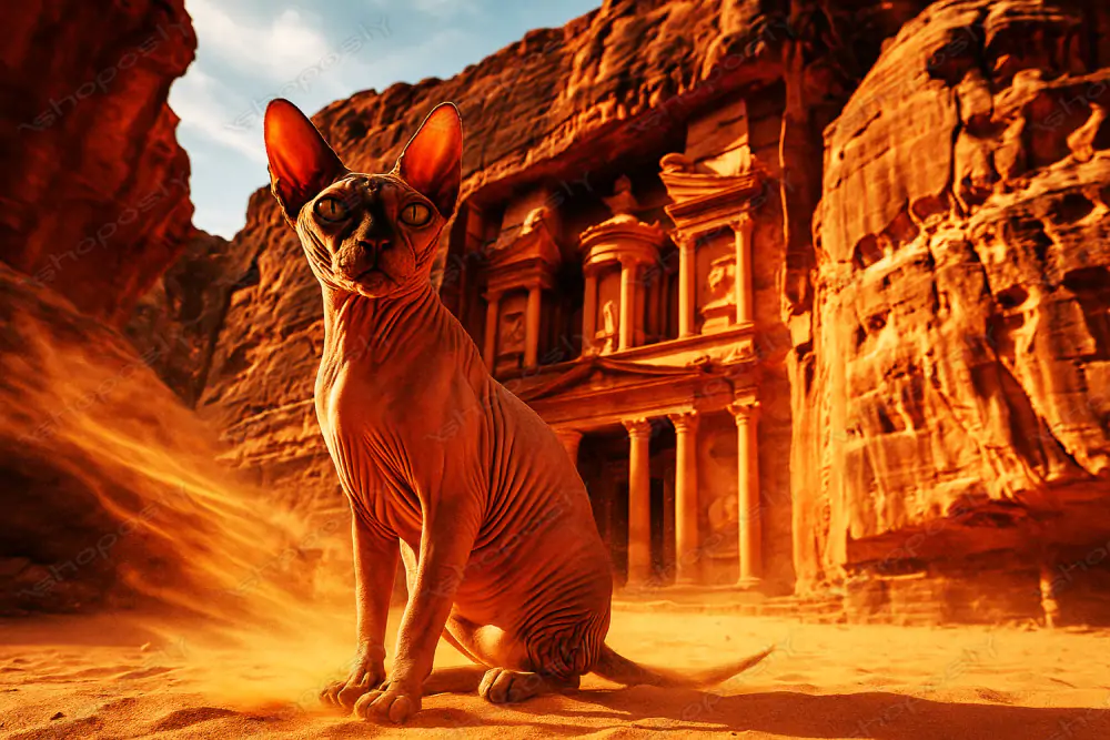 This awe-inspiring, ultra-realistic digital artwork captures a surreal fusion of feline elegance and ancient architectural majesty in breathtaking detail. The centerpiece of the scene is a majestic Sphynx cat, seated regally in the foreground of Petra, Jordan’s world-renowned archaeological treasure. The wide-format composition (4500 x 3000 pixels) fully immerses the viewer in a dramatic desert setting, where the past and present collide under golden sunlight and swirling sand.
