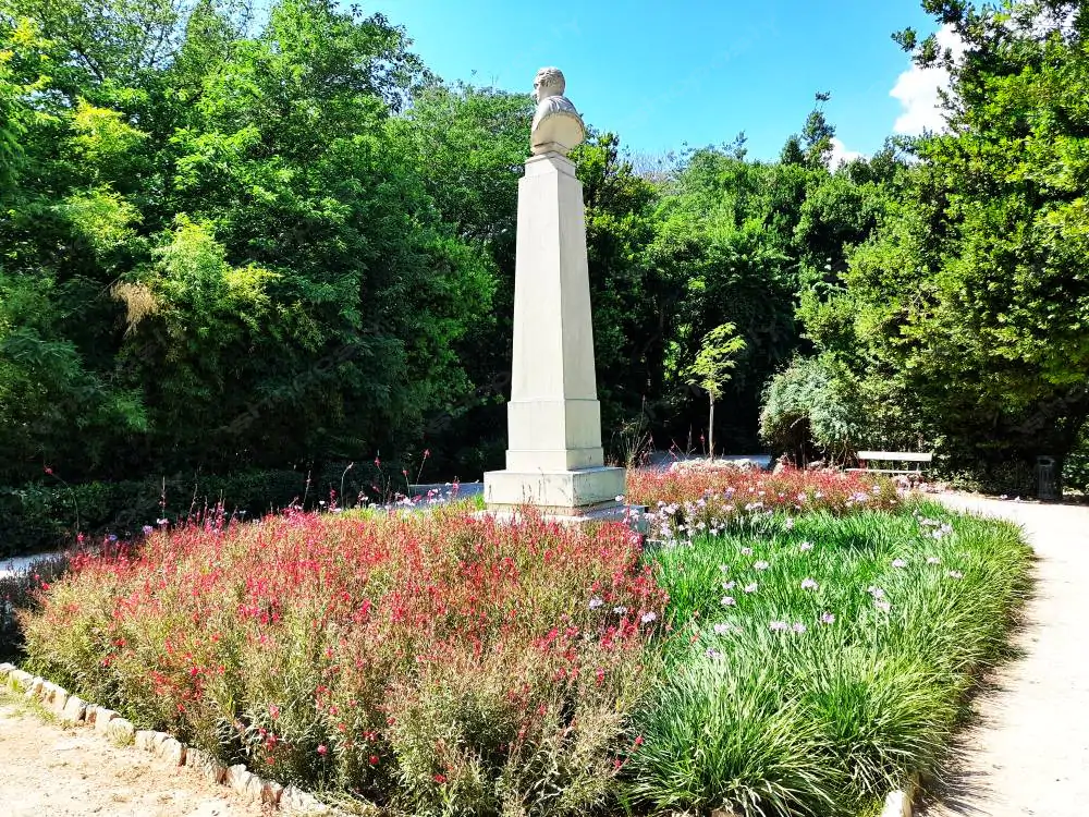 Centered in a vibrant circular bed of red and purple flowers, a tall marble bust monument rises with dignity. The elegant landscaping and clean design make this a strong architectural contrast to the surrounding wildness of the garden's greenery.