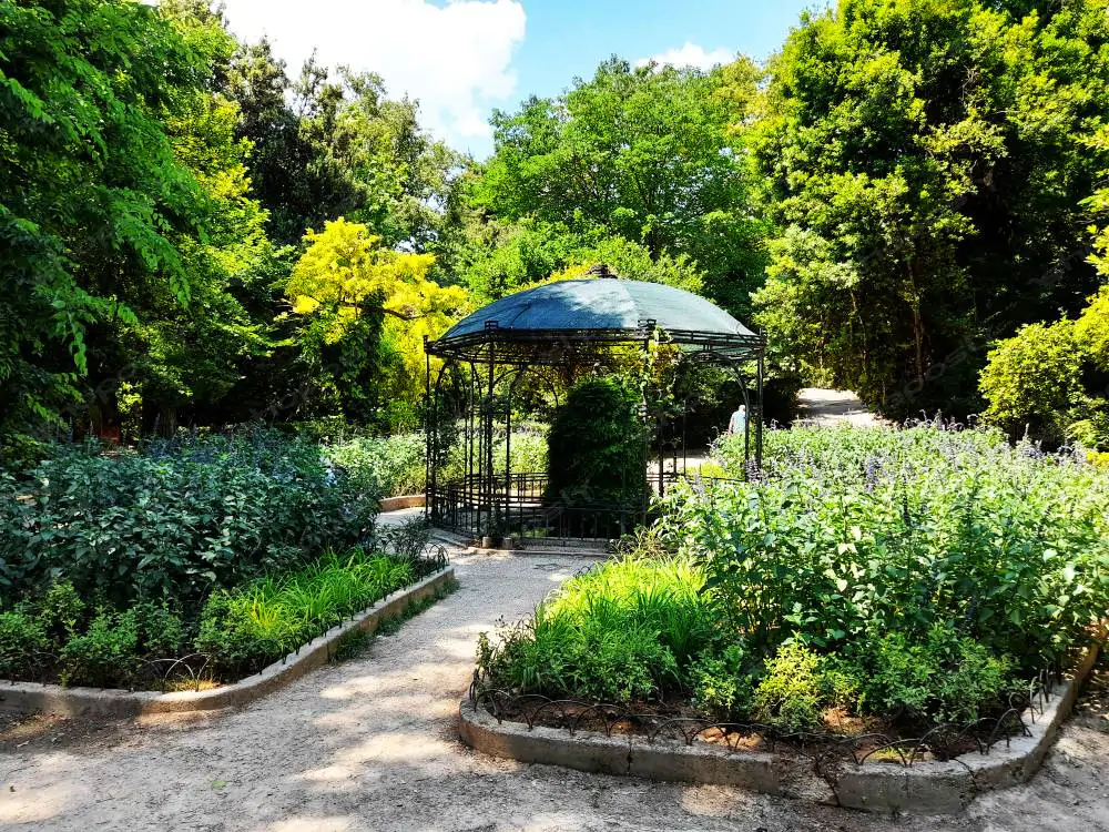 Nestled between fragrant flowerbeds and geometric garden design, a small pavilion with wrought iron architecture rests in the center. The lush backdrop of yellow and emerald trees evokes a painterly composition, blending nature with classical structure.