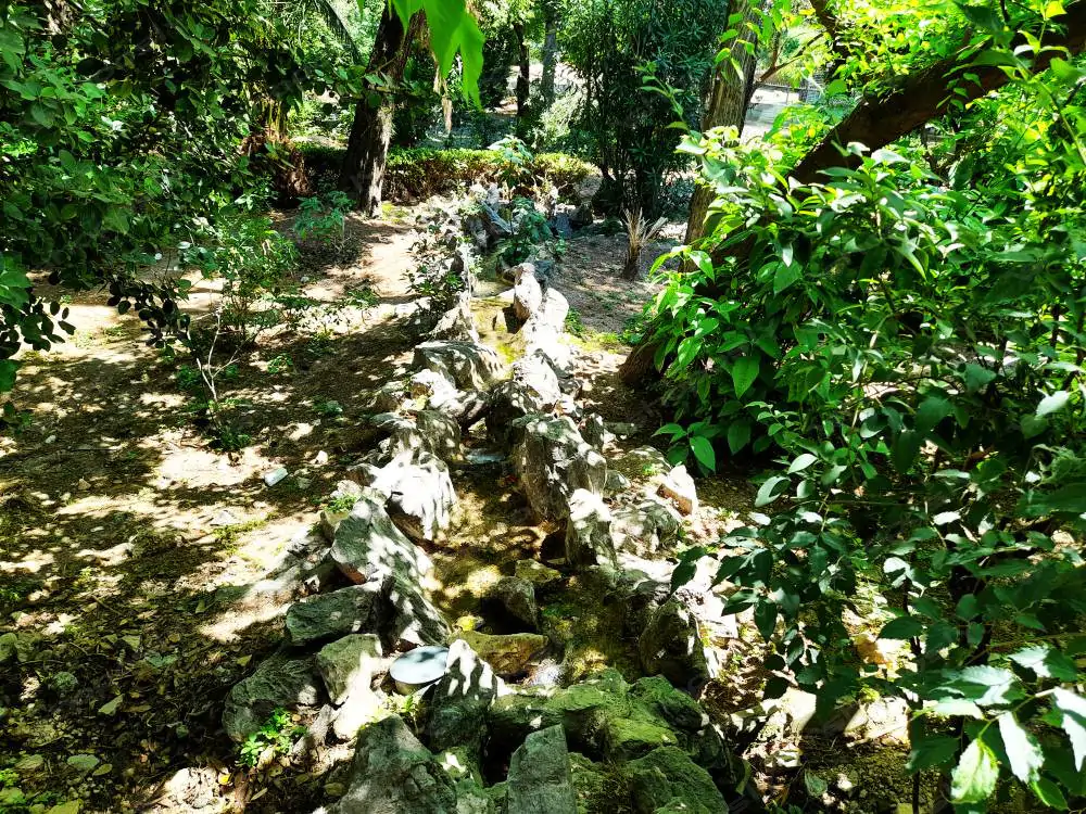 This natural stone water channel winds its way through a shaded woodland section of the garden. While the water is minimal, the dry streambed forms a rustic visual element, enhanced by fallen leaves and natural undergrowth — evoking an untouched, ancient feel.