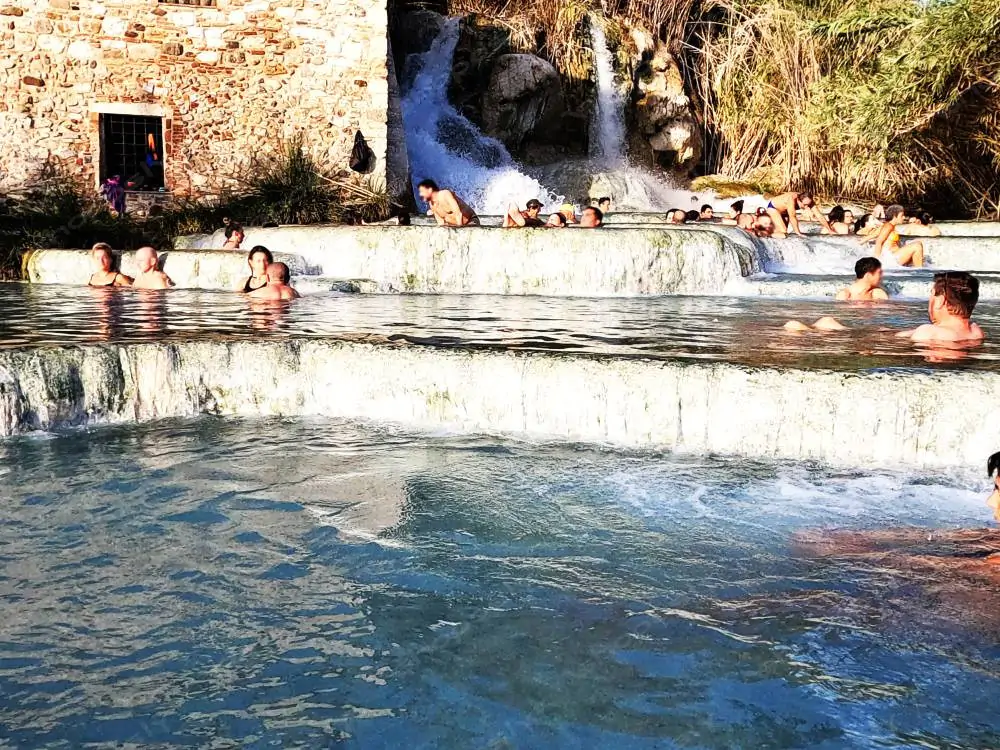 Captured across different moments and angles, this collection reveals people of all ages immersed in the soothing pools, mineral-laden waters glistening under the Tuscan sun, and details of cascading formations shaped by both water and time. From wide panoramas to tight focus shots of the flowing edges, these images reflect the raw beauty and healing energy of Cascate del Mulino.