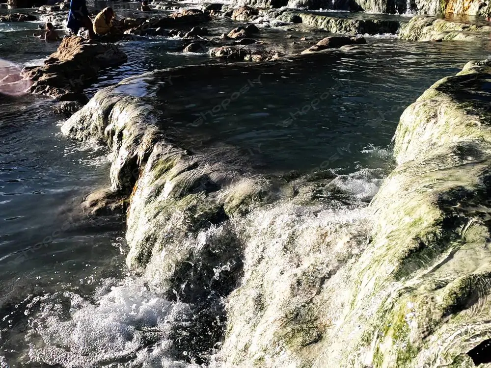 Tourists and locals are seen lounging in the various levels of the springs — some in intimate pools, others exploring or chatting in groups. These candid, respectful captures add human warmth to the natural spa.