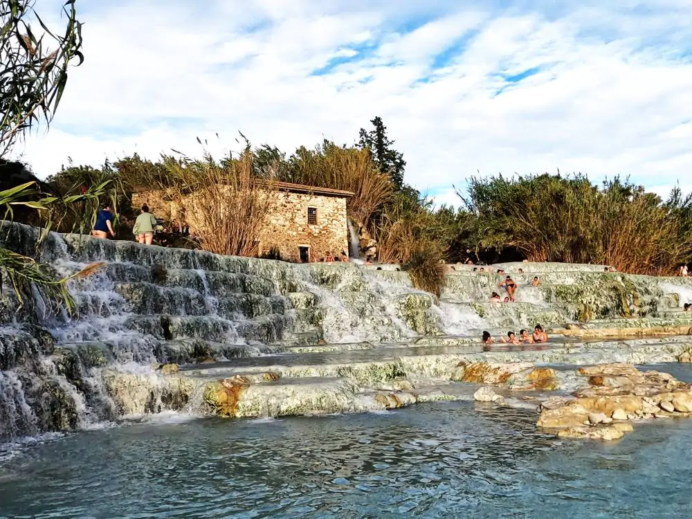 The old stone building at the top of the terraces, a historic structure once used as a mill, stands as a rustic backdrop to the entire site. Its golden-brown stone contrasts beautifully with the cool blue pools and adds a sense of timelessness.