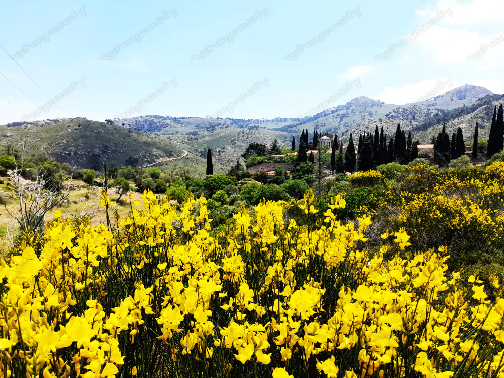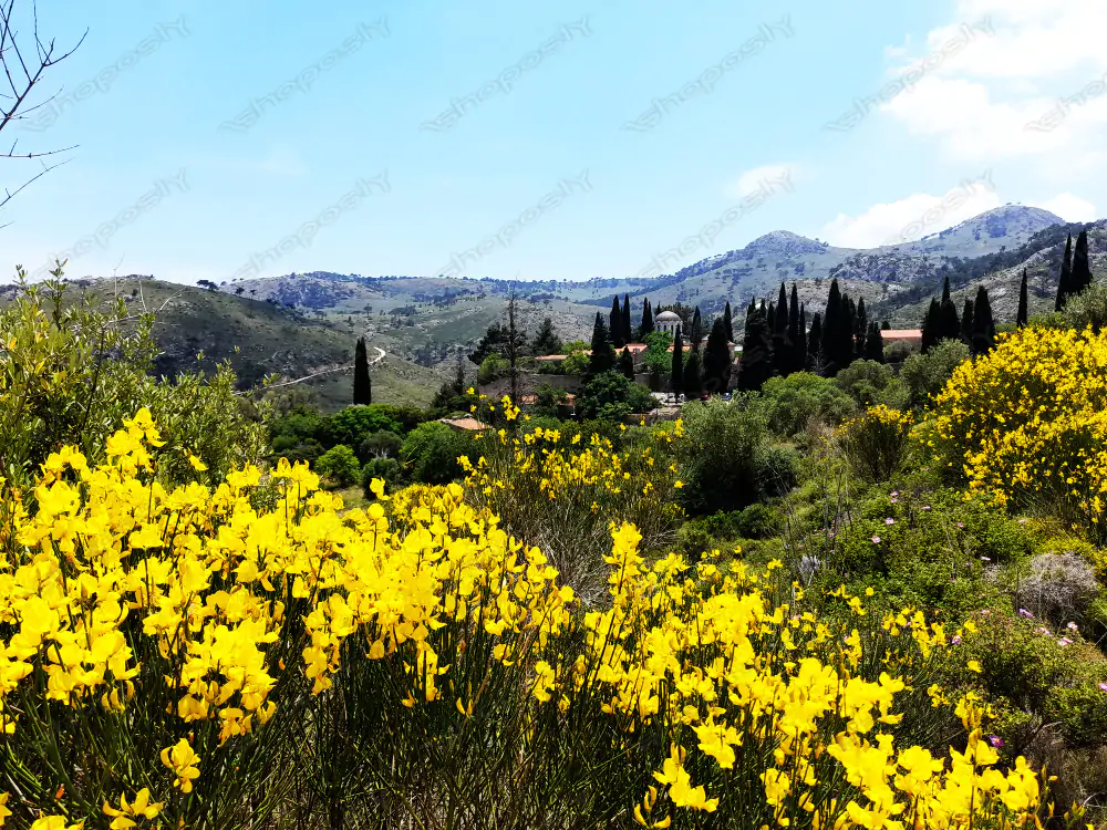 The third image opens the perspective to a sweeping landscape, where vast swathes of Spanish Broom spill across rolling hills. The eye is drawn toward the distant village, with its cypress-lined silhouette and traditional Mediterranean rooftops, perfectly complementing the golden foreground. The flowers dominate the lower frame, their abundance forming a vibrant carpet that softens the rugged terrain. Here, the plant becomes not just a botanical subject but an integral part of the cultural and natural identity of the landscape, signaling the arrival of summer with its bright color and heady scent.