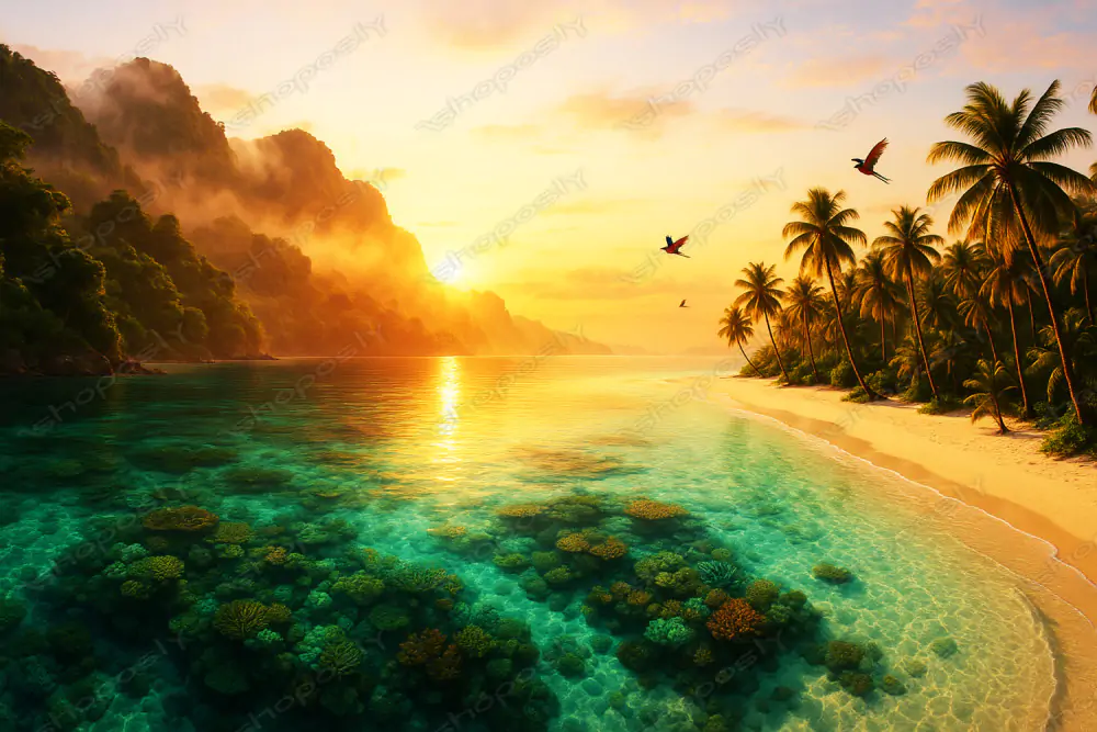 This awe-inspiring AI-generated artwork captures a breathtaking tropical paradise during the golden hour of sunrise. Crafted with meticulous detail and panoramic vision, the scene is a visual symphony of color, light, and serene composition — an untouched haven where ocean, jungle, and sky unite in harmony. From the gently swaying palm trees and turquoise waters to the vibrant coral reefs below the surface, every pixel radiates a sense of calm and immersive natural beauty.