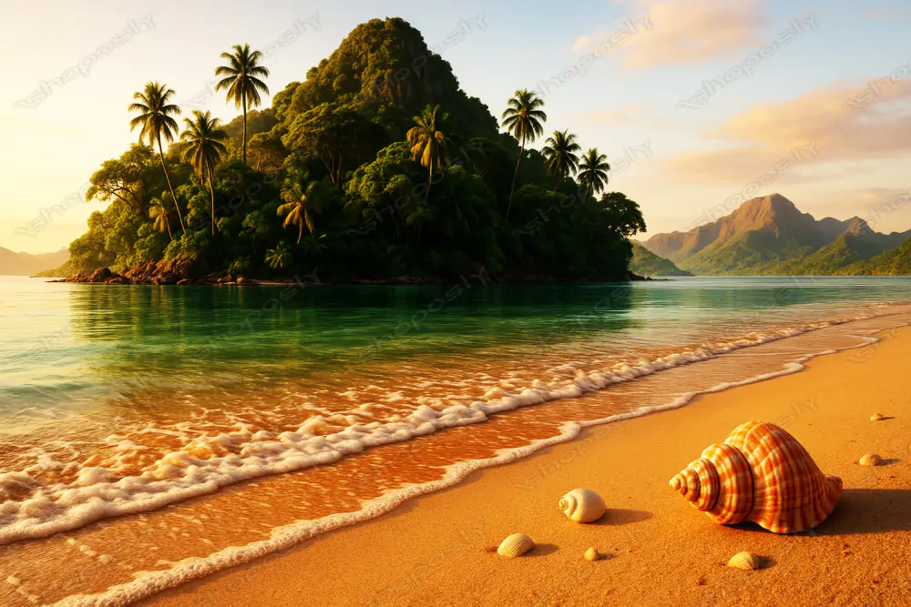 The composition opens along a warm sandy shore in the foreground. The silky, tan-hued beach curves gracefully with the shoreline, inviting the viewer into the scene as if they’re standing at the edge of a dream. Tiny foam-tipped waves lap rhythmically against the coast, their movement frozen in time. Scattered across the sand, a handful of seashells lie undisturbed — each one unique in form, tone, and size. The highlight among them is a large conch shell, placed prominently in the lower right of the image. Its spiral shape, warm amber stripes, and slightly weathered surface glow softly in the evening light, anchoring the viewer’s focus with a sense of tactile realism.