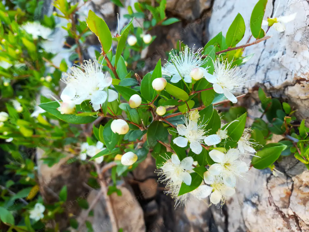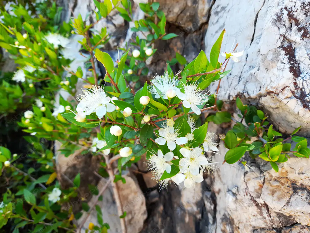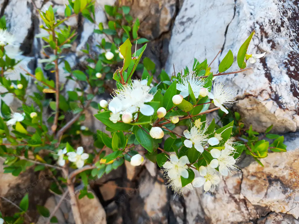 This exquisite high-resolution photographic set (4000 x 3000 px) captures the timeless beauty of the White Myrtle (Myrtus communis) in full bloom, growing naturally against rugged rocky terrain. Featuring three real photographs taken in natural daylight, the images reveal the plant’s delicate white blossoms, unopened buds, and lush green foliage with exceptional clarity and precision.